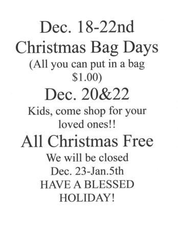 All our items are donated, which allows us to keep prices very low. We accept donations of good clean, gently used items that are not in need of repair: seasonal clothing, household items, purses, games, toys, etc. Donations of clothing and household items are accepted during hours of operation.